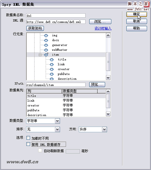 弹出【Spry XML 数据集】对话框,【XML源】可以是本地目录下的XML数据,也可以是跨域的远程XML数据。