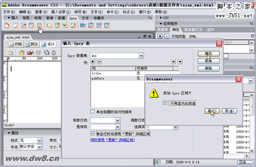 【确定】插入Spry表,提示需要插入Spry区域。因为所有的Spry XML 数据必须在 Spry区域中才能显示。