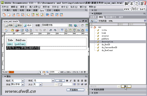 鼠标光标停留在Spry详细区域内,打开【绑定】面板,选择“description”元素【插入】到 Spry详细区域中。