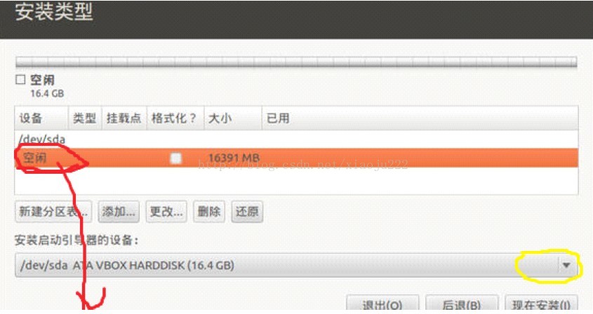 到上图这一步后一定要找到红色划线部分的空闲区间,当初你分出来的盘是多大,图中就会显示多大,找到后双击空闲区间那一部分会弹出分配框让你进行分配.而黄色画圈部分的选项一定要选择被分为/boot 的那个区(应该为整个硬盘大小的选项),如果不是整个磁盘的大小会导致安装结束后不能进入系统。