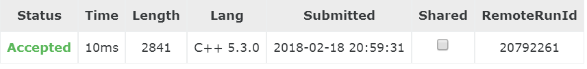 1 #include<iostream> 2 #include<cstring> 3 #include<cstdio> 4 #include<vector> 5 #include<queue> 6 using namespace std; 7 int r0,c0,r2,c2,r1,c1,dir; 8 const char *dirs = "NESW"; 9 const char *turns = "FLR"; 10 const int dr[] = {-1,0,1,0}; 11 const int dc[] = {0,1,0,-1}; 12 const int maxn = 10; 13 int dir_id(char s){return strchr(dirs,s) - dirs;} 14 int turn_id(char s){return strchr(turns,s) - turns;} 15 int has_edge[maxn][maxn][4][3];// 表示当前状态(r,c,dir),是否可以沿着转弯方向[trun]行走。 16 struct Node{ 17 int r,c,dir; 18 Node(int r=0,int c=0,int dir=0):r(r),c(c),dir(dir) {} 19 }; 20 int d[maxn][maxn][4];///表示初始状态到(r,c,dir)的最短路径长度 21 Node p[maxn][maxn][4];///用来记录从哪一步走到(r,c,dir),即其父节点 22 ///读入地图 23 bool read_input() 24 { 25 char s[99],s2[99]; 26 if(scanf("%s%d%d%s%d%d",s,&r0,&c0,s2,&r2,&c2) != 6) return false; 27 cout<<s<<endl; 28 dir = dir_id(s2[0]); 29 r1 = r0 + dr[dir]; 30 c1 = c0 + dc[dir]; 31 memset(has_edge,0,sizeof(has_edge)); 32 for(;;) 33 { 34 int r,c; 35 cin>>r; 36 if( r == 0) break; 37 cin>>c; 38 while(cin>>s && s[0] != '*') 39 { 40 for(int i=1;i<strlen(s);i++)///将当前路口(r,c),可以的前进方向存到has_edge中 41 has_edge[r][c][dir_id(s[0])][turn_id(s[i])] = 1; 42 } 43 } 44 return true; 45 } 46 ///从当前节点u,转向为i,前进一步 47 Node walk(Node u,int i) 48 { 49 int temp = u.dir; 50 if(i == 1) temp = (temp+3)%4;///逆时针旋转,L 51 if(i == 2) temp = (temp+1)%4;///顺时针旋转,R 52 return Node(u.r + dr[temp],u.c + dc[temp],temp); 53 } 54 ///判断是否出界 55 bool inside(int r,int c) 56 { 57 return r >= 1 && r <= 9 && c >= 1 && c <= 9; 58 } 59 ///将结果进行打印 60 void print_ans(Node u) 61 { 62 vector<Node> nodes; 63 for(;;) 64 { 65 nodes.push_back(u); 66 if(d[u.r][u.c][u.dir] == 0) break; 67 u = p[u.r][u.c][u.dir]; 68 } 69 nodes.push_back(Node(r0,c0,dir)); 70 ///打印解,每行10个 71 int cnt = 0; 72 for(int i=nodes.size()-1;i>=0;i--) 73 { 74 if(cnt % 10 == 0) printf(" "); 75 printf(" (%d,%d)",nodes[i].r,nodes[i].c); 76 if(++cnt % 10 == 0) cout<<endl; 77 } 78 if(nodes.size() % 10 != 0) cout<<endl; 79 } 80 ///BFS 81 void solve() 82 { 83 queue<Node> q; 84 memset(d,-1,sizeof(d)); 85 Node u(r1,c1,dir); 86 d[u.r][u.c][u.dir] = 0; 87 q.push(u); 88 while(!q.empty()) 89 { 90 Node u = q.front();q.pop(); 91 if(u.r == r2 && u.c == c2) {print_ans(u);return;}///到达终点 92 for(int i=0;i<3;i++)///3个方向,0-F,1-L,2-R 93 { 94 Node v = walk(u,i);//超当前方向走,下一个结点 95 if(has_edge[u.r][u.c][u.dir][i] ///1.判断是否能向当前方向走 96 && inside(v.r,v.c)///2.判断是否出界 97 && d[v.r][v.c][v.dir] < 0)///3.判断是否已经走过这条路 u->v 98 { 99 d[v.r][v.c][v.dir] = d[u.r][u.c][u.dir]+1; 100 p[v.r][v.c][v.dir] = u;//记录父节点 101 q.push(v); 102 } 103 } 104 } 105 cout<<" No Solution Possible"<<endl;//走了所有可以走的可能, 无法到达终点 106 } 107 int main() 108 { 109 while(read_input()) 110 { 111 solve(); 112 } 113 114 return 0; 115 }
