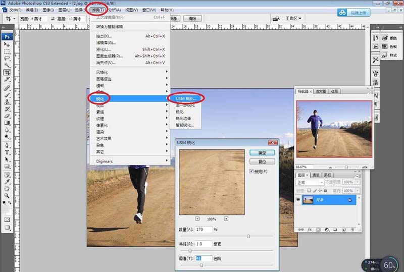 2、对图片进行锐化,点击滤镜——锐化——USM锐化,或者选择其它的锐化,USM锐化就要设置数量、半径和阈值。也可以勾选“预览”来查看效果。
