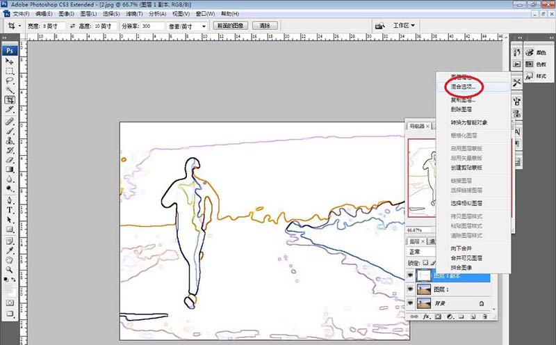 7、右击新的图层——混合选项——混合模式,然后选择正片叠底。点击确定。接着用橡皮擦擦掉多余的线条,只保留人物外轮廓和衣服褶皱处。