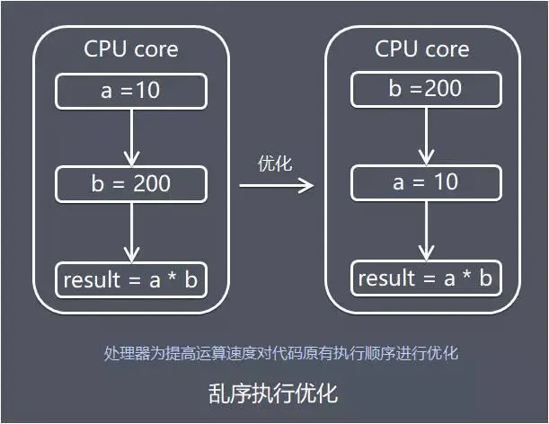 为了使得处理器内部的运算单元尽量被充分利用,提高运算效率,处理器可能会对输入的代码进行乱序执行,处理器会在计算之后将乱序执行的结果重组,乱序优化可以保证在单线程下该执行结果与顺序执行的结果是一致的,但不保证程序中各个语句计算的先后顺序与输入代码中的顺序一致。