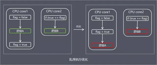- 在处理器乱序执行优化情况下,有可能导致flag提前被设置为true,导致逻辑B先于逻辑A执行。