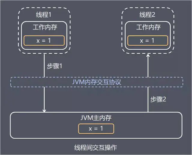 线程1和线程2都有主内存中共享变量x的副本,初始时,这3个内存中x的值都为0。线程1中更新x的值为1之后同步到线程2主要涉及2个步骤: