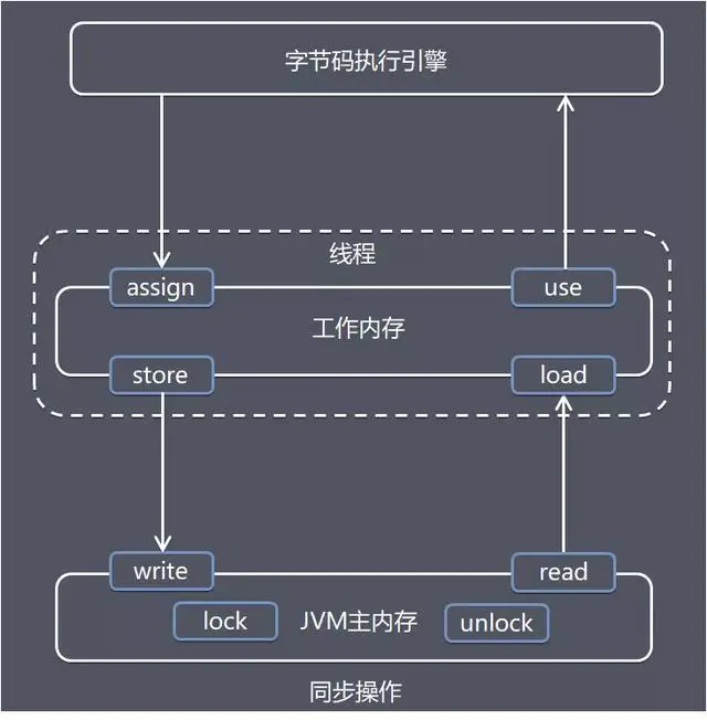 - assign (赋值) 作用于工作内存的变量,它把一个从执行引擎接收到的值赋给工作内存的变量,每当虚拟机遇到一个给变量赋值的字节码指令时执行这个操作。