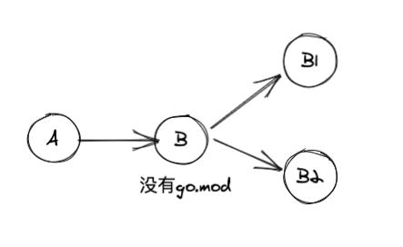 如下图所示,Module A 依赖 B,但是 B 还未切换成 Module,即没有go.mod文件,此时,当使用go mod tidy命令更新A的go.mod文件时,B的两个依赖B1和B2将会被添加到A的go.mod文件中(前提是A之前没有依赖B1和B2),并且B1 和B2还会被添加// indirect的注释。