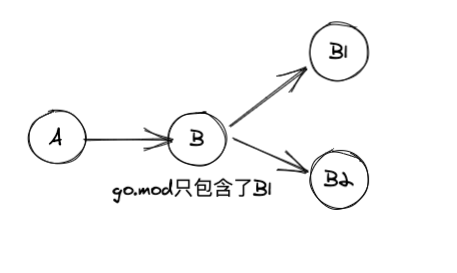 如下图所示,Module B虽然提供了go.mod文件中,但go.mod文件中只添加了依赖B1,那么此时A在引用B时,则会在A的go.mod文件中添加B2作为间接依赖,B1则不会出现在A的go.mod文件中。