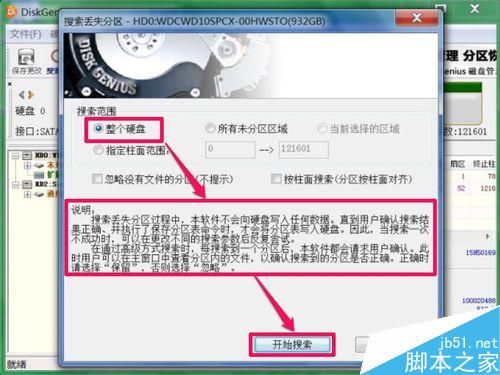 在按“开始搜索”前,最好把“说明”仔细看一下,其实这个搜索,不会对硬盘有任何损害,如果搜索出的分区正确,按保留,不正确,按忽略。