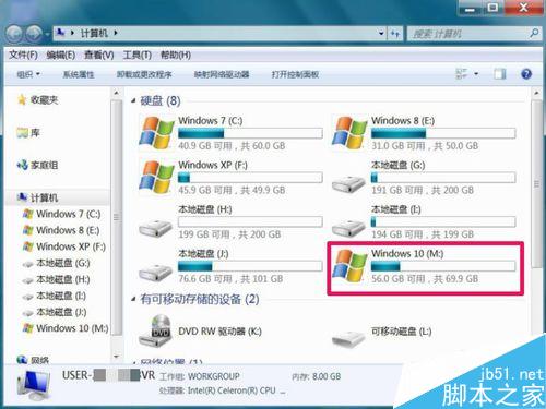 搜索完成,分区表也恢复后,回到电脑中,看到完整的八个磁盘,里面的文件一个也没少,但有一点错误,就是原来D盘的盘符变成M盘了。