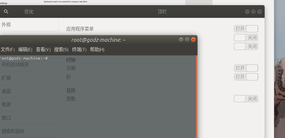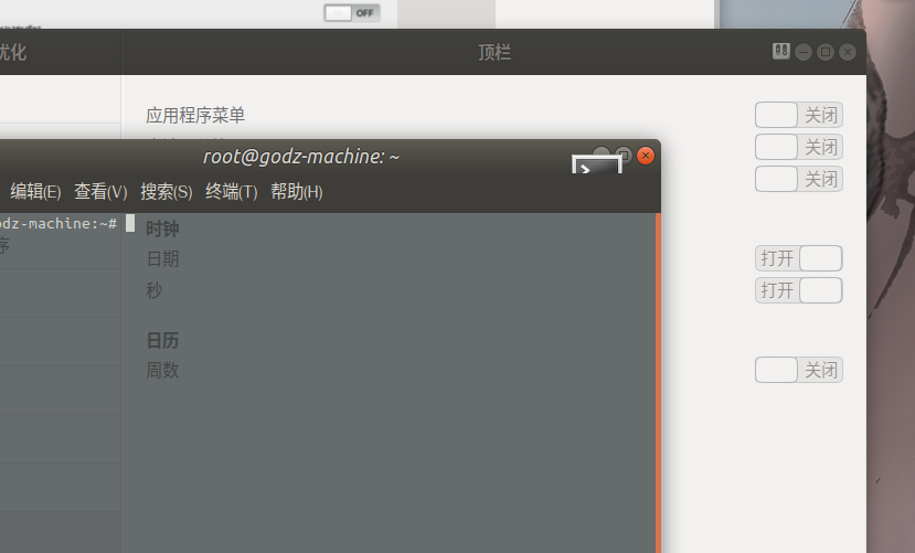 该问题的造成是由于开启了应用程序菜单这一栏,但是我们看到界面显示是关闭,但是这个时候,实际上是开启的,不知道是什么状况,这个工具是通过apt安装的gnome-tweak-tool。这个应该是一个显示bug。我们只要使它处于打开状态,就可以关掉这个小图标了。如下图: