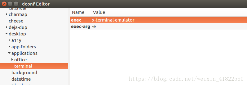安装成功后,终端中输入命令 “dconf-editor” 来打开这个工具,然后从左边的的菜单栏中按照下面的步骤依次进入指定的菜单项:org > gnome > desktop > applications > terminal