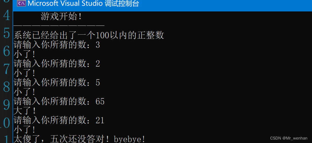 以上就是高大狗最近收集整理的关于2.(c语言游戏)猜数游戏:系统给出100以内的随机数,你有五次机会猜数,如果大于给出数,提示”大了”,相反则“小了”的全部内容,更多相关2.(c语言游戏)猜数游戏:系统给出100以内内容请搜索靠谱客的其他文章。