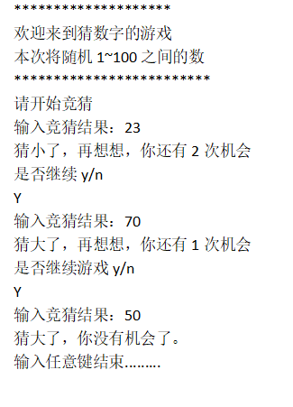 以上就是震动洋葱最近收集整理的关于c#猜数字游戏,随机产生一个0~100的数,有三次机会的全部内容,更多相关c#猜数字游戏,随机产生一个0~100内容请搜索靠谱客的其他文章。