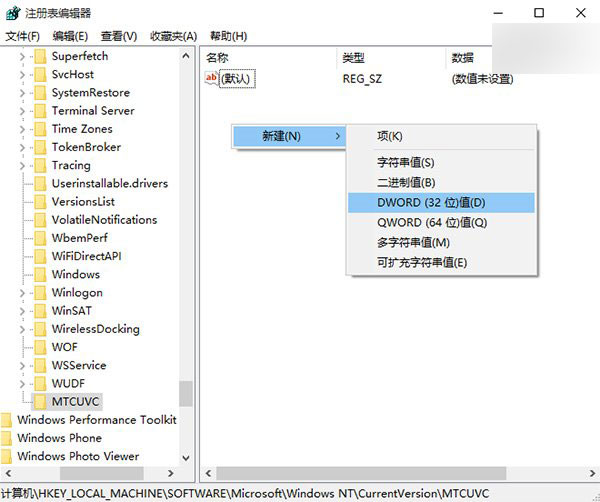 3、点击MTCUVC后,在右侧空白位置单击右键,新建“DWORD(32位)值”,重命名为EnableMtcUvc,数值数据为0(保持默认即可)
