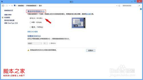 在弹出的“显示”面板,将“更改所有项目大小”,这里我们选择“较小-100%”,点击“应用”