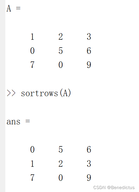 sortrows(A)表示以第一列的数据为标准从小到大排列并对应更改行数据