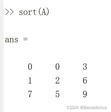 sort(A)表示将每一列的数据重新从小到大排列并形成新的矩阵
