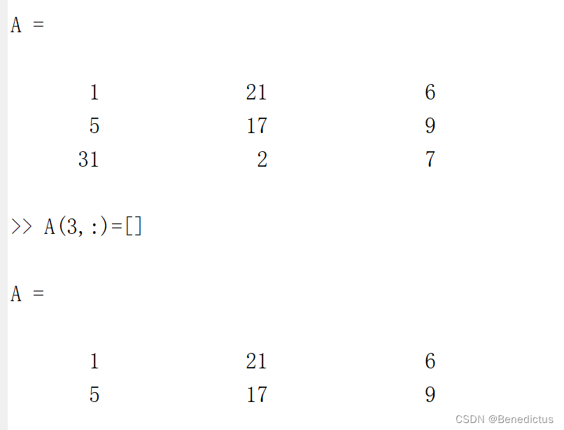 将第三行的值赋予一个空的[]达到删除第三行的目的,同理可得删除第三列: