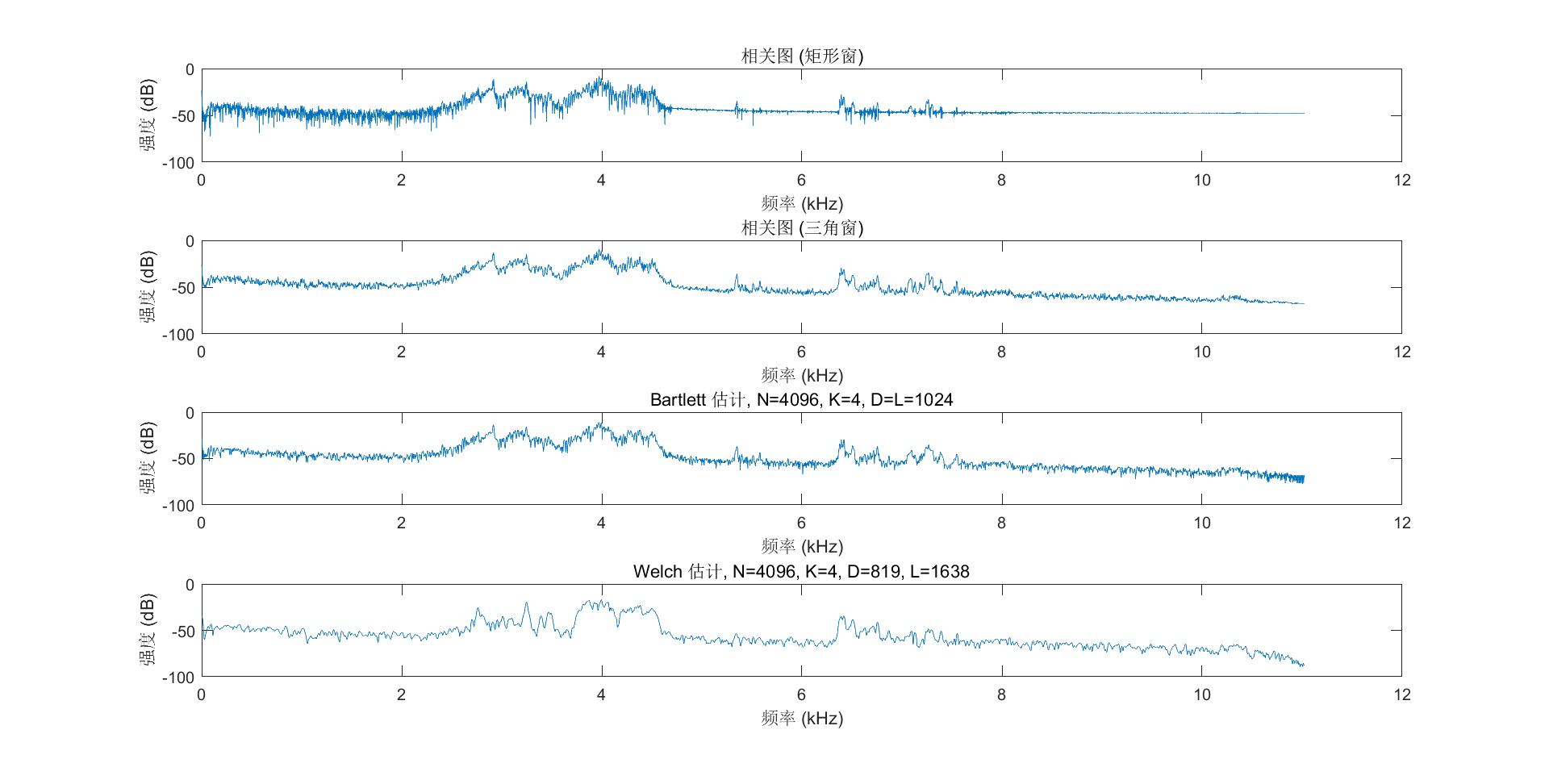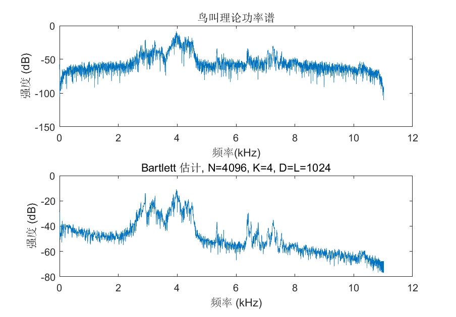 title('Bartlett 估计, N=4096, K=4, D=L=1024')