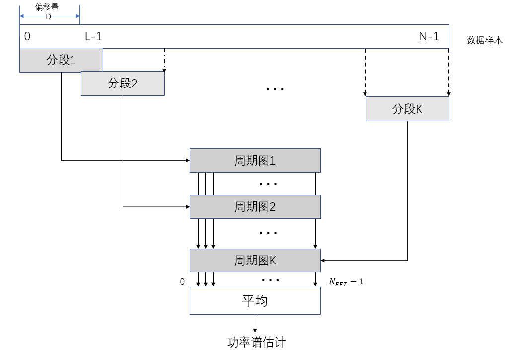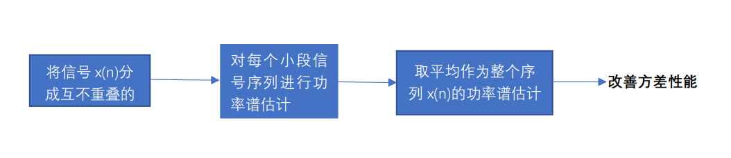 为改善周期图较差的方差性能,M. S. Bartlett 提出平均周期图法,即将信号序列x(n)分成互不重叠的若干段,对每个小段信号序列进行功率谱估计,然后再取平均作为整个序列 x(n) 的功率谱估计。