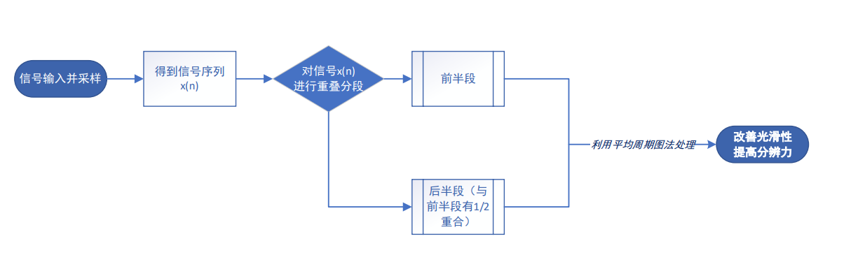趋于一致估计,分段平均减小了由数据样本本身的随机性带来的方差,段数越多方差越小,但分辨率下降。分段多了每段的点数必然少了,所以采用2:1分段,拉长了每小段长度,有利于平滑过渡。