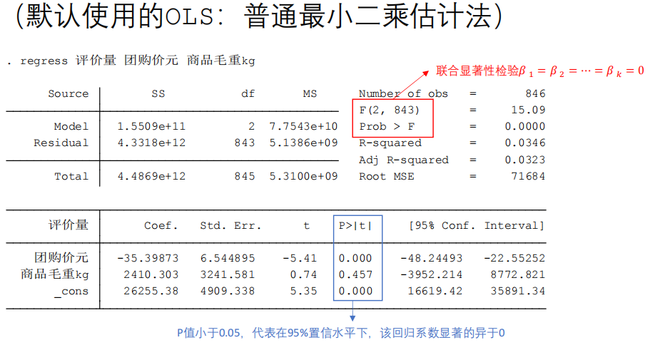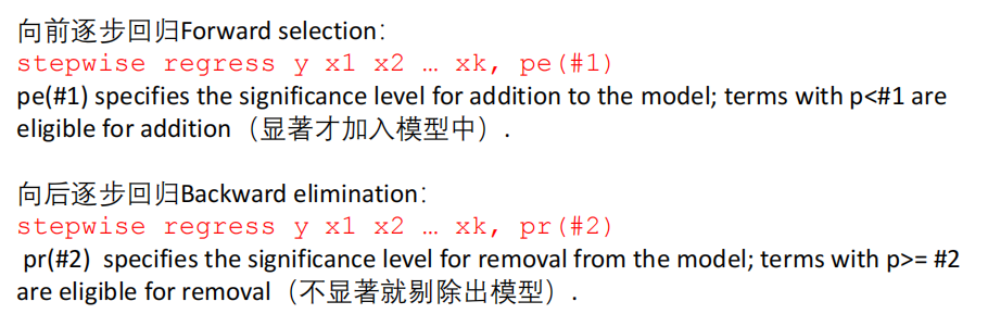 reg 自变量 因变量1 因变量2....(定性数据要以虚拟变量的形式加入)【另外stata会自动解决数据完全多重共线性的问题,即将虚拟变量组合当中的一个作为对照】
