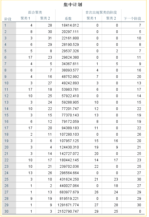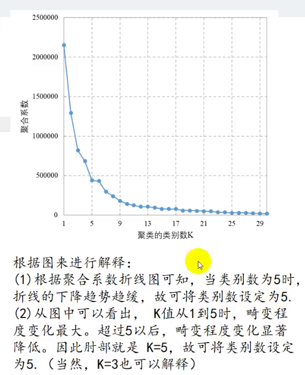 其中最后一个阶段有一个类,29阶段2个....第一个阶段就是n-1,其中的系数就是所有类的总畸变程度(可用来画肘部图,依次来估计最优的聚类数目)【先对其降序排序然后画散点图】