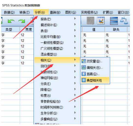 SPSS:导入数据->调整变量类型->分析->相关->典型相关性