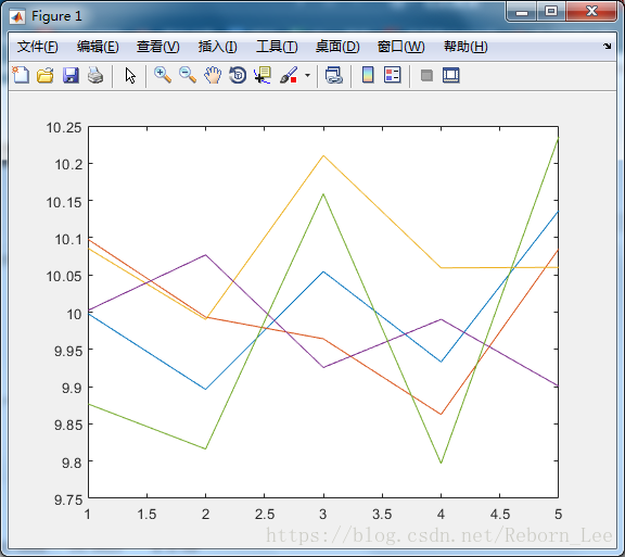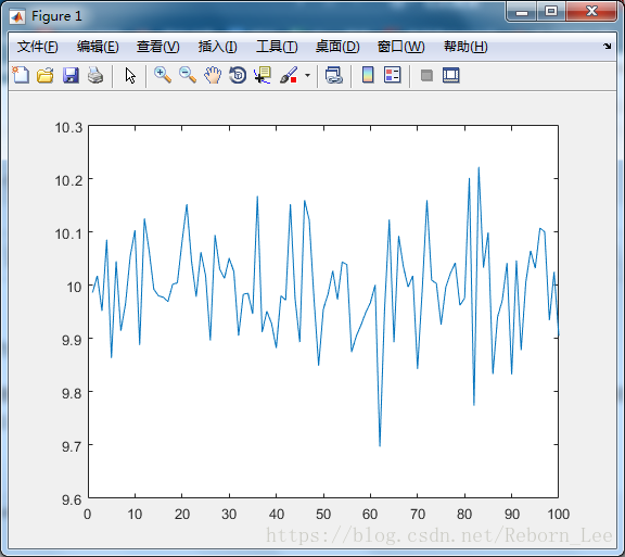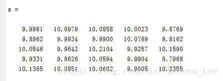 产生一个随机分布的指定均值和方差的矩阵:将 randn 产生的结果乘以标准差,然后加上期望均值即可。例如,产生均值为10,方差为 1/100 的一个1*5的随机数方式如下: