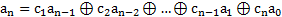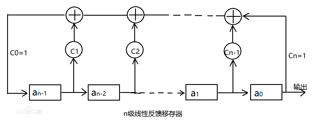 递推关系式又称为反馈逻辑函数或递推方程。如下图所示的线性反馈移位寄存器的初始状态为(a0a1…an-2an-1),经过一次移位线性反馈,移位寄存器左端第一级的输入为![]()