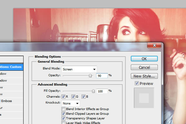 6、现在改变图层样式混合选项,把混合模式改为“滤色”,并降低不透明度为90%。