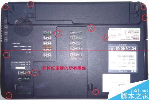 1、用十字螺丝刀拧下图上红圈标的所有螺丝,完成后检查一遍保证螺丝全部拆除。(外观能看到的螺丝都拆下来)(螺丝分类保管,外面的螺丝放一起,硬盘盖上的2个螺丝可以分开放)。