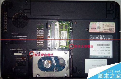 2、拆开硬盘外面的盖板,拆下图上红圈上的螺丝(螺丝拆下后将硬盘往右拖动后再拿起,光驱也是往右拖就能拿下)。