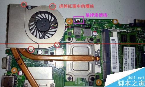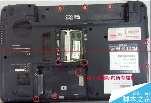 3、硬盘、光驱拆下后,将图中红圈的螺丝全部拆下(这部分螺丝可以放一起)。