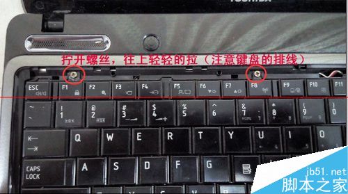5、拆下图片红圈里的螺丝,往上轻轻拉一下键盘就出来了(键盘下面有排线,拉的幅度一定要小)。
