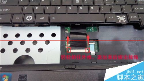 4、拆除键盘红框里的横条,用一字螺丝刀由左往右撬,看图片最下面拆下来的横条,红圈标的是卡扣位置,根据卡扣位置慢慢弄出横条。
