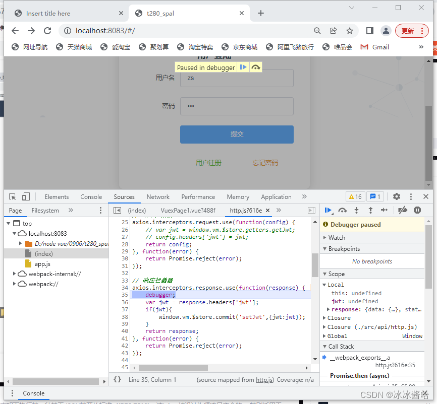 4.前端服务器会有响应拦截器拦截,截取到响应头承载jwt的字符串,会放到vuex中