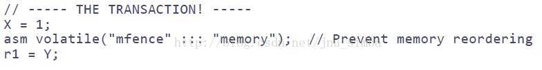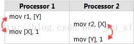 •假设X,Y初始化为0; 根据p1和p2的运行顺序不同,按常规不乱序执行来说,r1, r2 的值可能为0,1(p1 first); 1,0;(p2 first) 1,1(concurrent); 但一定不会出现0,0;的状态,实际上测试运行多次,会出现0,0;的状态,因为cpu在运行指令时将load 操作提前了。测试代码