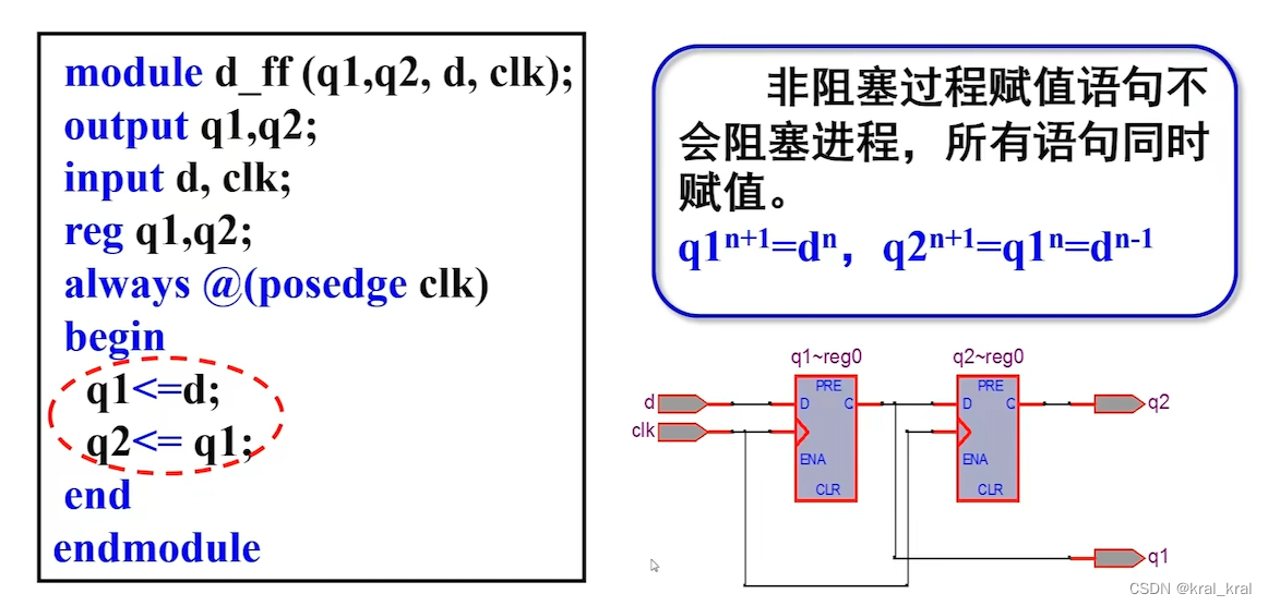 非阻塞赋值实现的功能相当于两个D触发器串联;