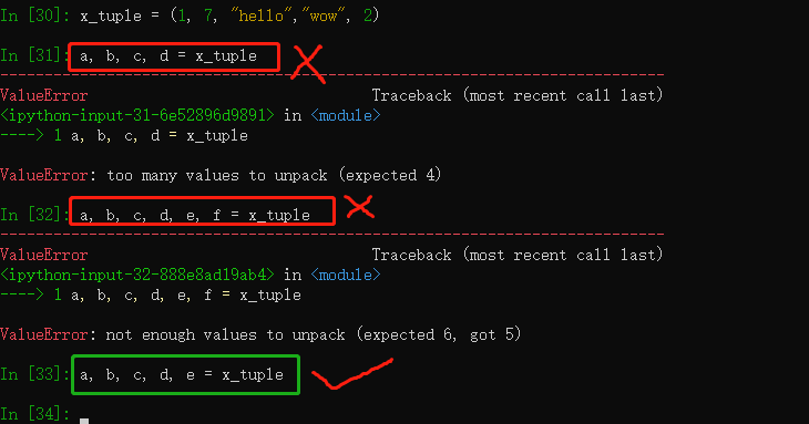 使用多重赋值技巧时,变量的数目和列表、元组或者字典的长度必须严格相等,否则Python将会给出ValueError:错误。如下: