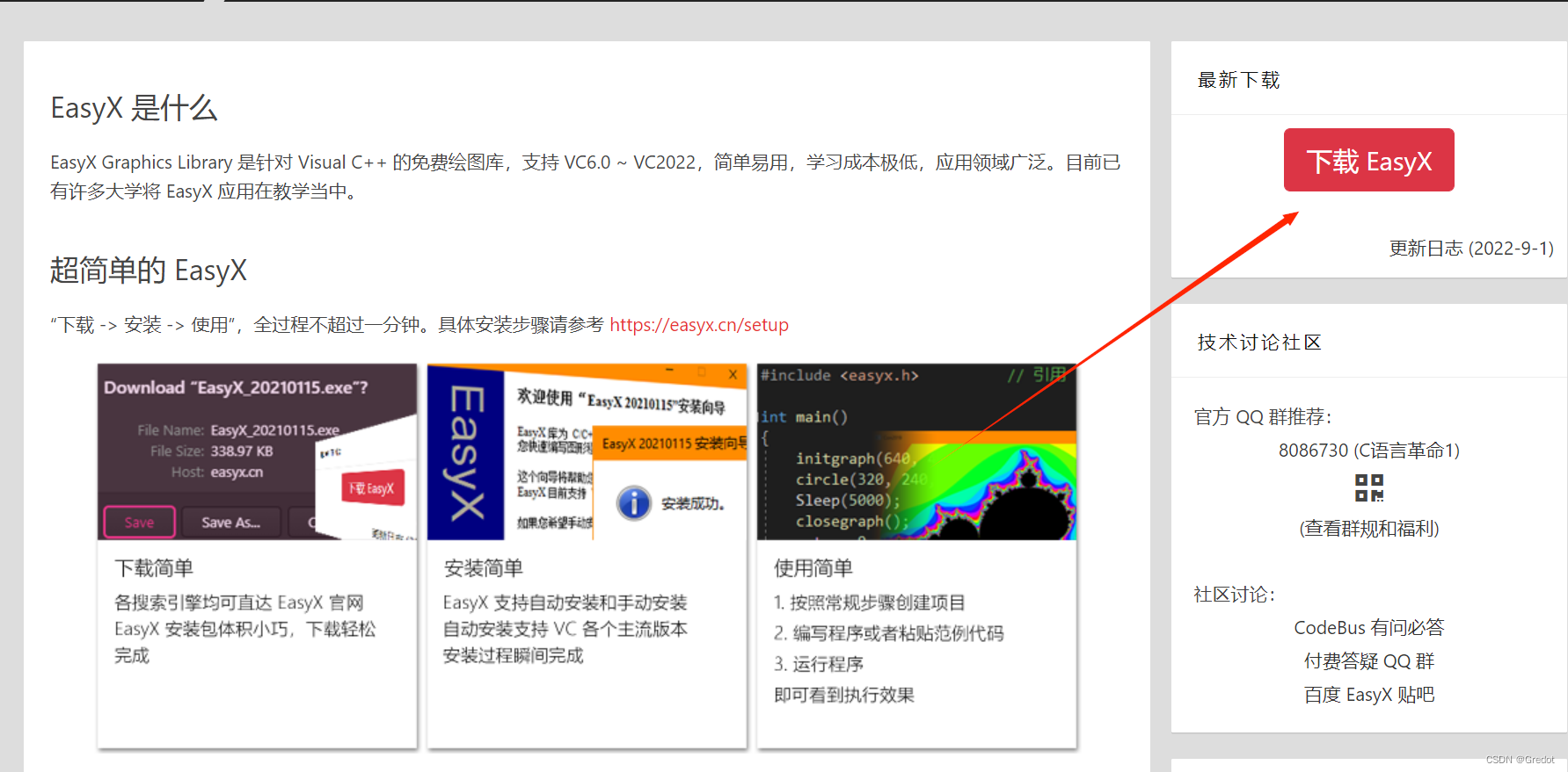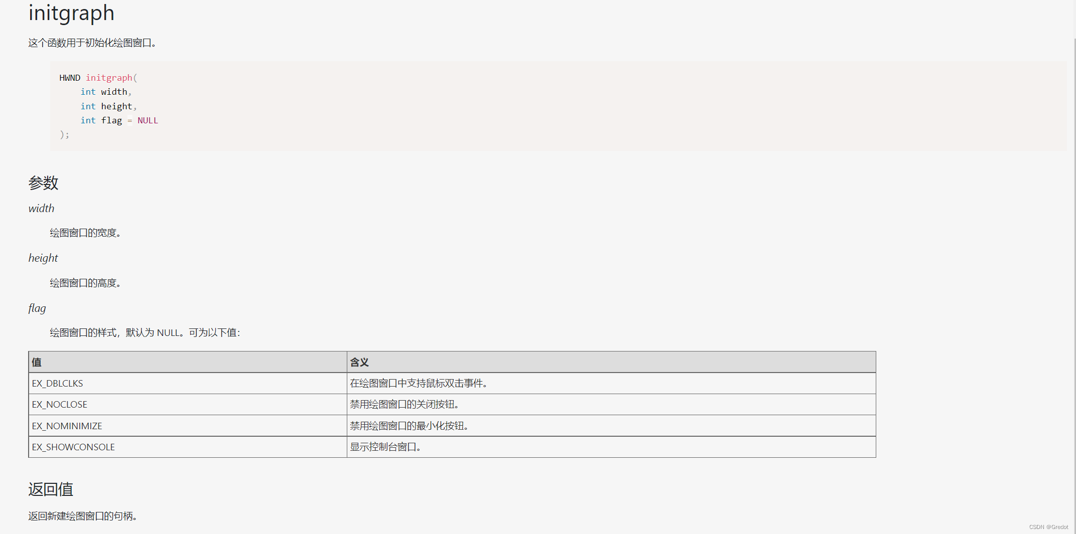 EasyX 文档 - initgraph 进入文档,找到要学习的库函数,了解函数的返回值,参数,和类型,对库函数的学习很重要哦,要学会自学,看文档很重要!