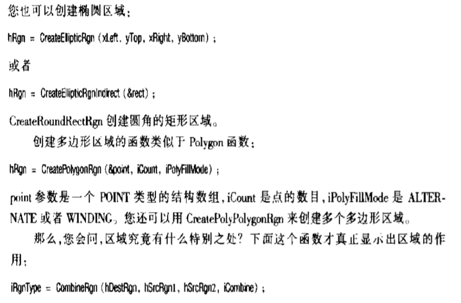 区域是对显示器上一个范围的描述,这个范围是矩形,多边形和椭圆形的组合。区域可以用于绘制和剪裁,通过将区域选进设备描述表,就可对其进行操作。