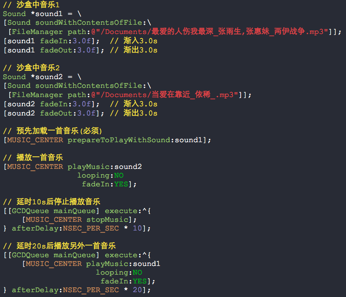 如果你的音乐不在bundle中,那标准的prepareToPlay方法无效.这种情形下,你需要使用prepareToPlayWithSound:方法代替,使用一个指定的方法来初始化.参数可以使一个文件名,文件路径(绝对或者相对),或者是一个Sound对象的实例.