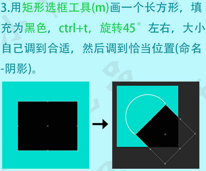 3、用矩形选框工具画一个长方形,填充为黑色,Ctrl + T 旋转45度左右,大小自己调到合适,然后调到恰当位置,命名为“阴影”。