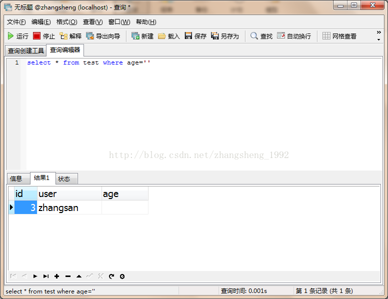 首先 我们创建一个表 user字段为允许null,age字段为允许null 都无默认值 age设定默认值Empty String