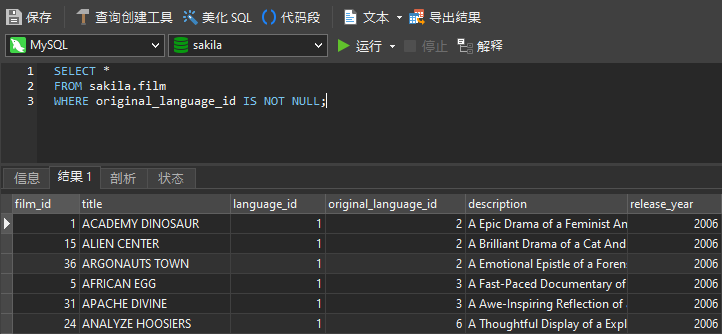 同样,您可以通过从NOT NULL子句中删除NOT来找出哪些行包含NULL值。现在,仅返回那些original_language_id列为NULL值的行: