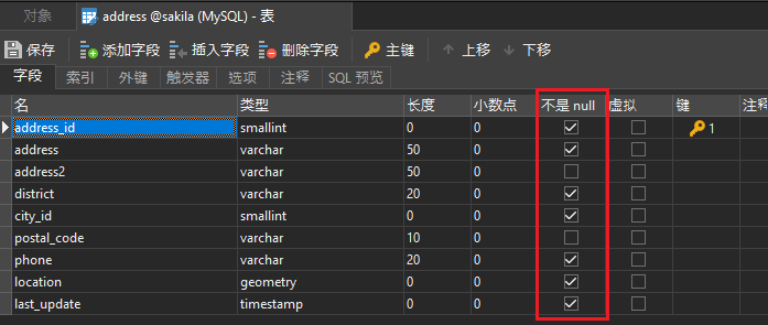 任何属于键值的列都不允许使用NULL,但是对于其他字段,则完全由您决定。在创建表时,在列定义旁边包含NOT NULL子句将强制用户在INSERT和UPDATE操作中为该列包含一个值。否则,将引发错误,并且操作将失败。Navicat Premium 的“表设计”界面包括“不为空”列,用于将字段指定为可为空或不可为空。这是Navicat 15的新深色模式: