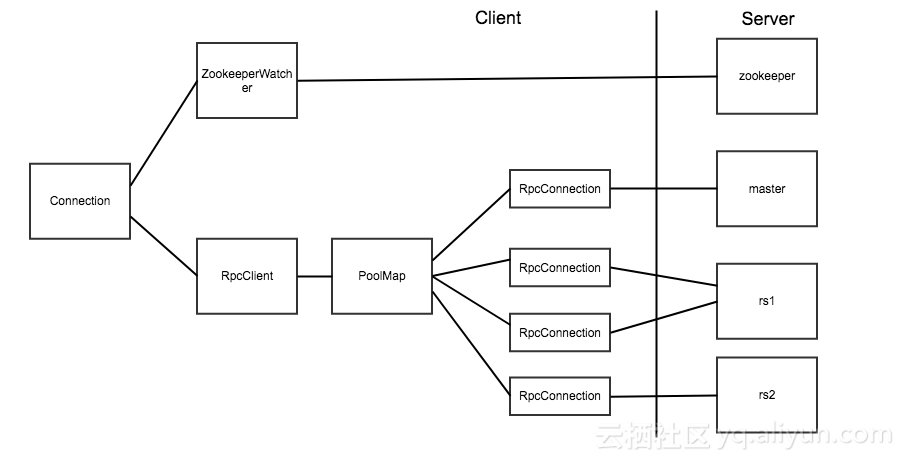 之所以封装这些连接,是因为HBase客户端需要连接三个不同的服务角色: